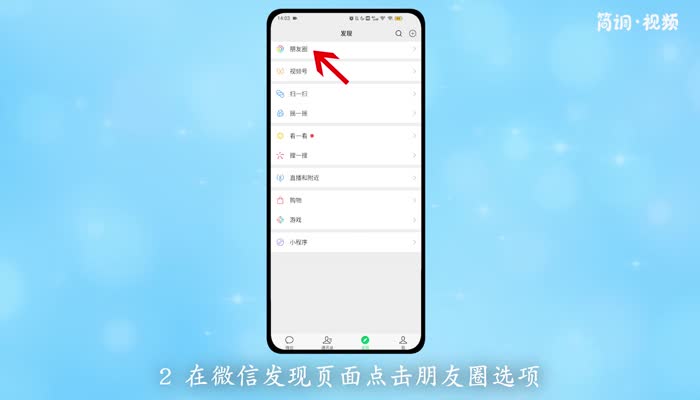 2.点击微信发现页面的“朋友圈”选项。进入朋友圈页面后,长按相机图标;