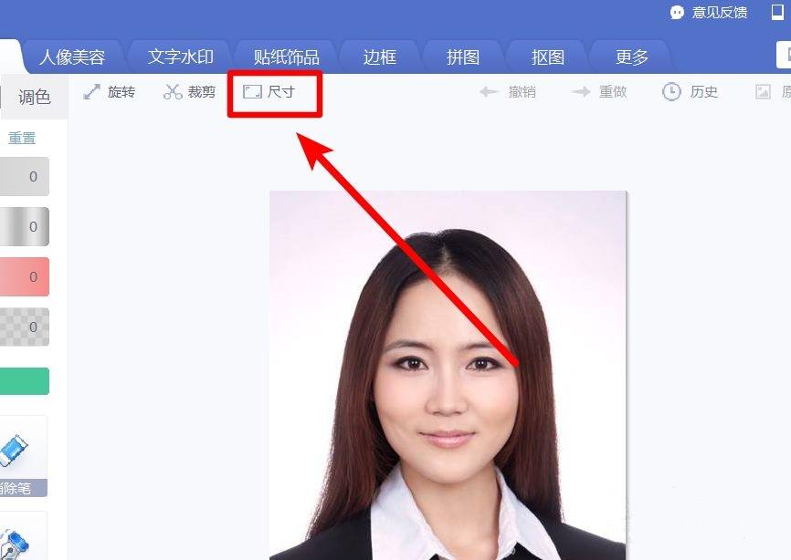 3.打开照片后,选择美图秀秀上方的大小选项。