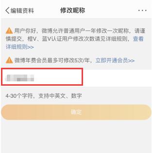 微博允许普通用户一年换一次昵称,开通微博年费的用户一年最多可以换五次昵称。当条件满足时,输入一个新的昵称,然后单击确定。
