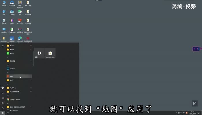 2.在弹出的开始菜单中,滑动鼠标滚轮找到“地图”应用。单击它打开地图。