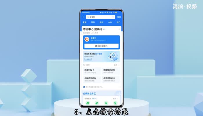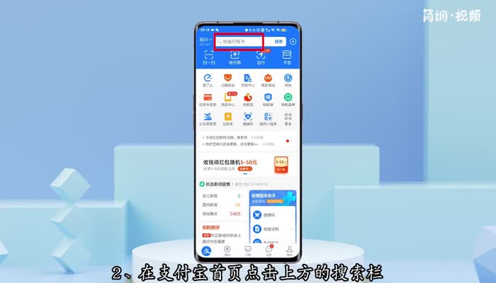 2.点击支付宝首页顶部的搜索栏,输入“健康码”,搜索;