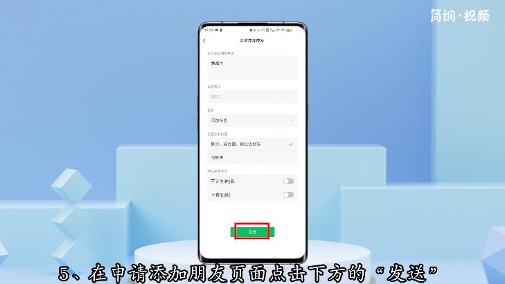 5.在申请添加好友的页面点击下方的“发送”,等待对方同意完成添加。