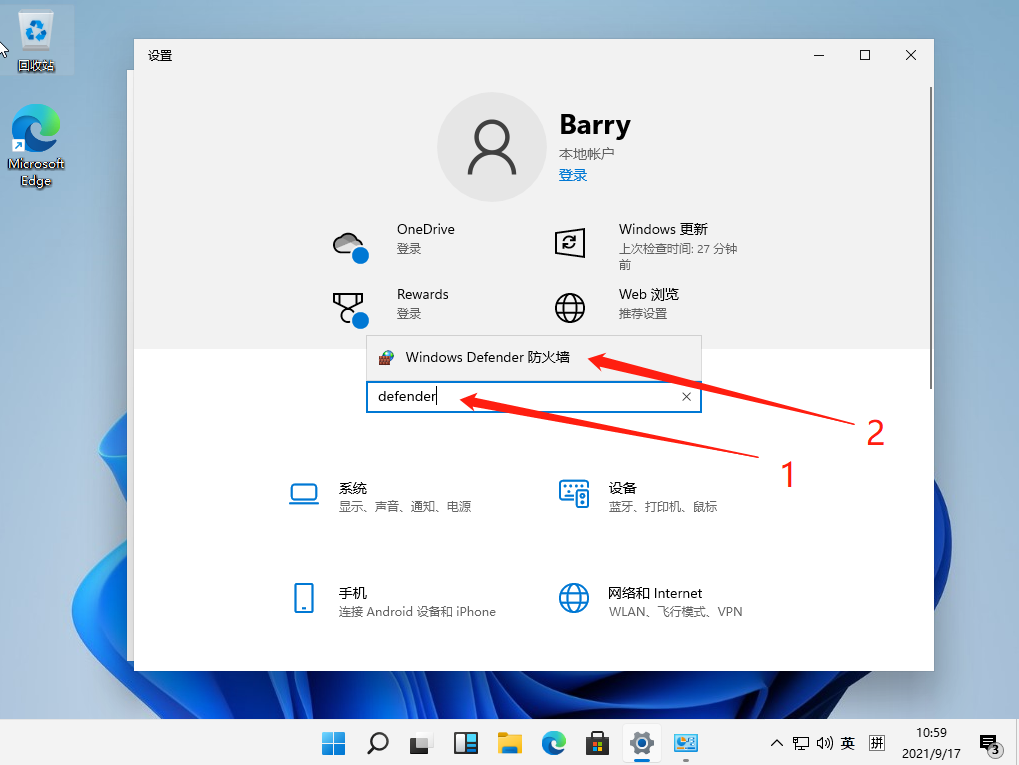 设置完成后,直接在顶部的搜索框中搜索【防御者】,防火墙就会弹出。