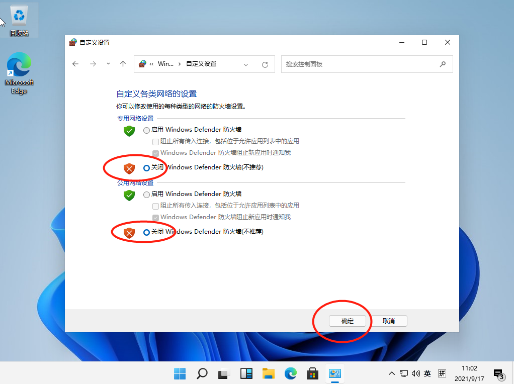 进入后,选择“关闭Windows defender防火墙”,点击确定。