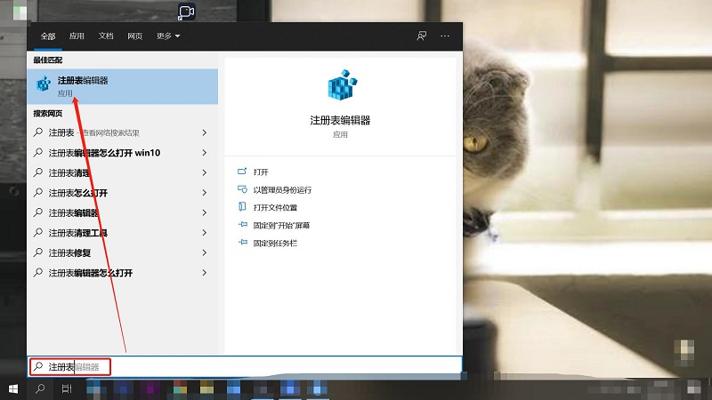 在Win10任务栏的搜索框中输入“注册表”,会在自动显示的搜索结果中看到“注册表编辑器”。单击打开注册表编辑器。