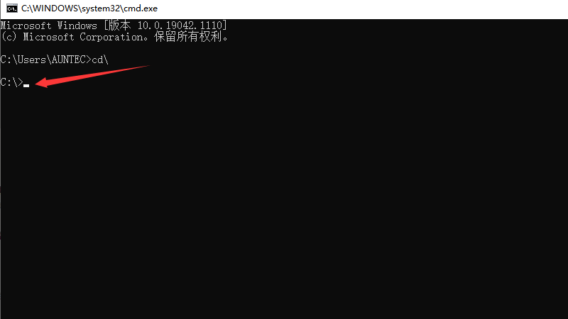 进入dos界面后,输入“cd”并回车。这时,前面的指示器会变成C:\