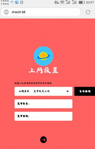 2.水星路由器将自动检测您的家庭宽带的互联网接入模式。请根据检测结果设置互联网访问参数。