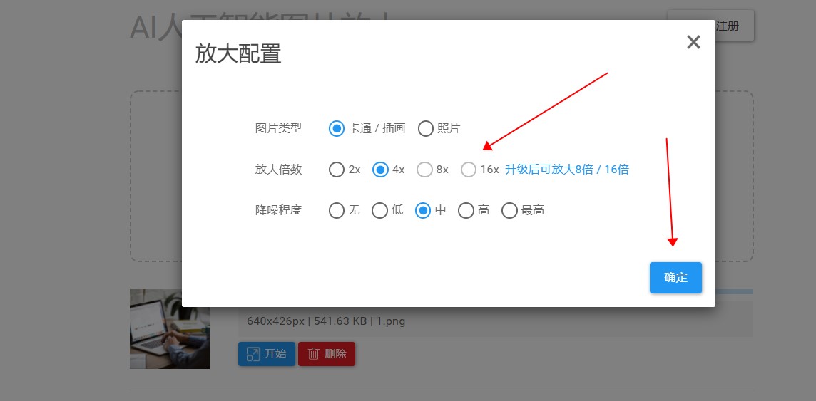 然后,在弹出的窗口中,选择图像类型、放大倍数和降噪程度,点击确定。