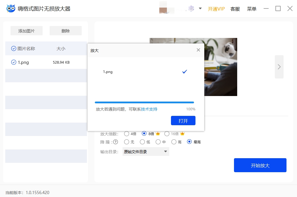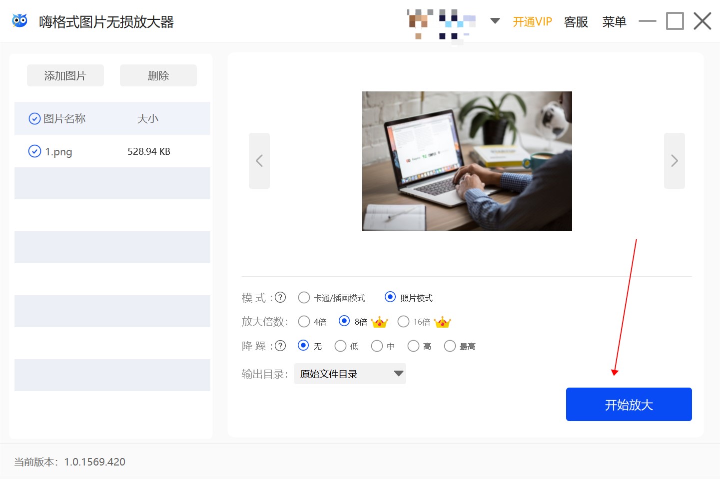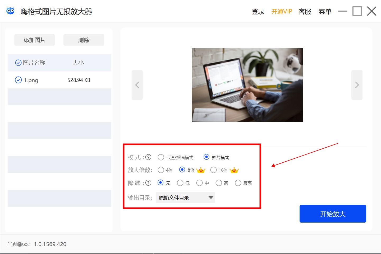 然后选择要放大的图片,选择图片模式、放大倍数、降噪程度、输出目录等。