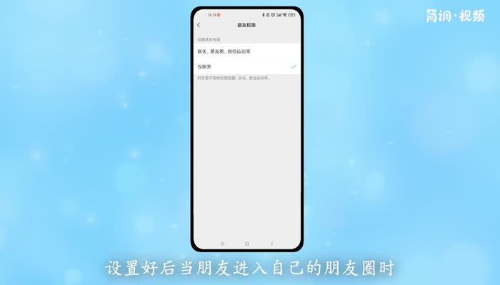 3.页面跳转后,在设置好友权限一栏勾选“仅限聊天”即可。设置后,朋友进入自己的朋友圈,就看不到我们朋友圈的内容了。
