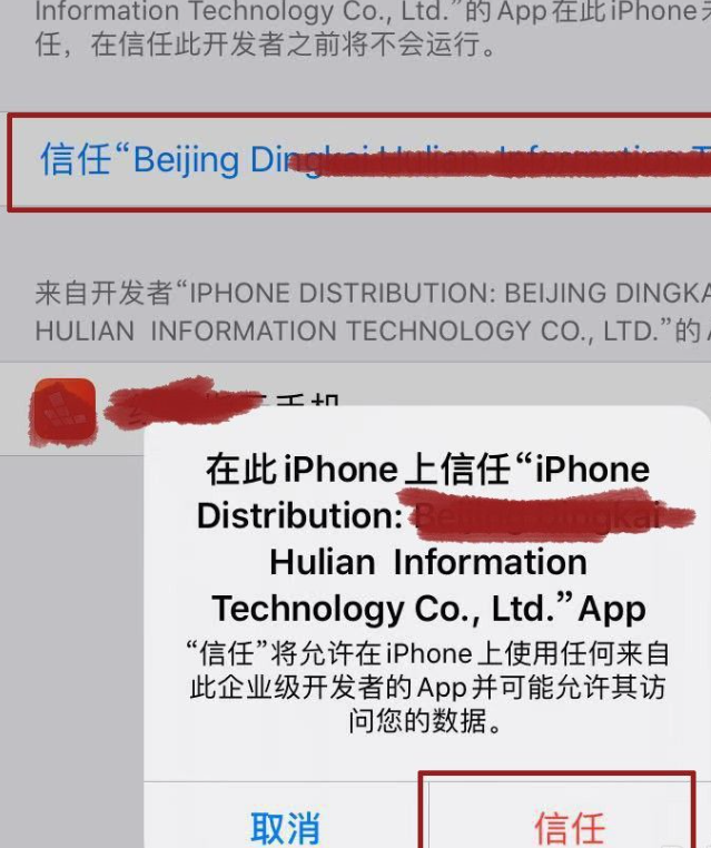 6.在打开的页面中点击“信任”,在弹出的对话框中再次点击“信任”按钮。信任授权完成后,再次打开APP时不会提示“不可信企业开发者”。