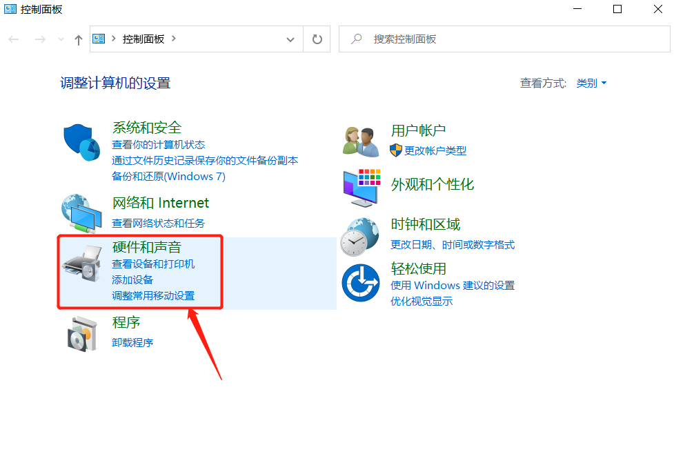 3.进入“控制面板”界面后,点击进入“硬件和声音”设置选项。