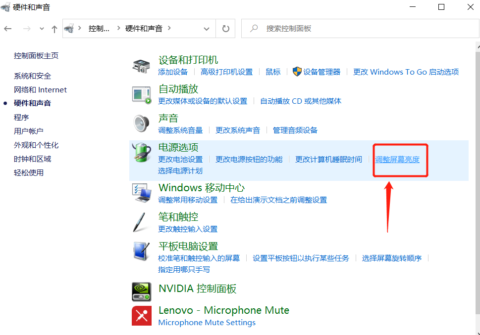 4.在“硬件和声音”界面中,点击进入亮度级别“电源选项”下的“调整屏幕亮度”设置选项。