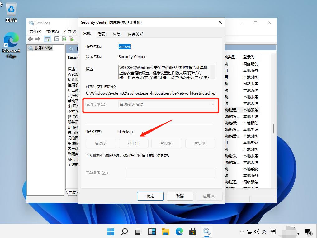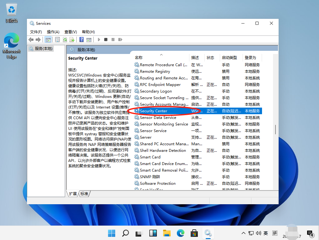 在服务窗口中,找到“安全中心”服务选项并双击它。