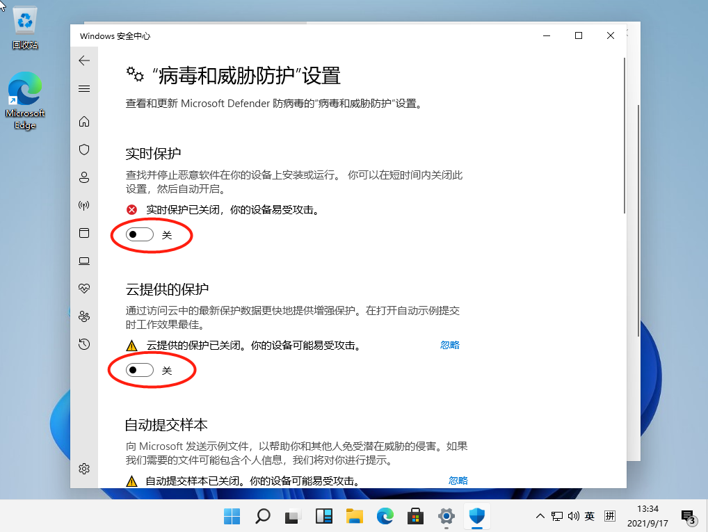 关闭右侧的“实时保护”和“云提供的保护”选项。