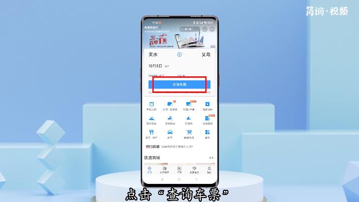 2.选择出行时间,点击“查询车票”,在弹出的页面中选择一个车次,点击进入订购界面;
