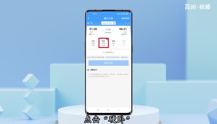 3.在订单界面,点击“硬卧”,选择旅客,然后在页面点击“提交订单”;