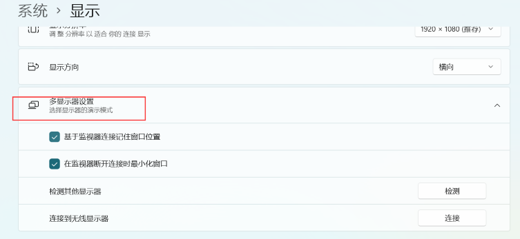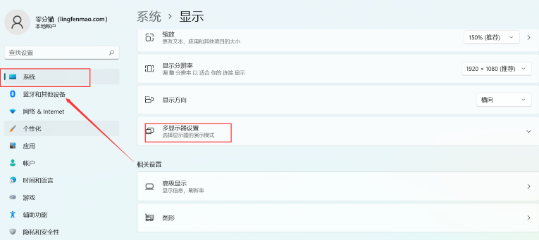单击左侧的“系统”,然后单击右侧的“多显示器设置”。