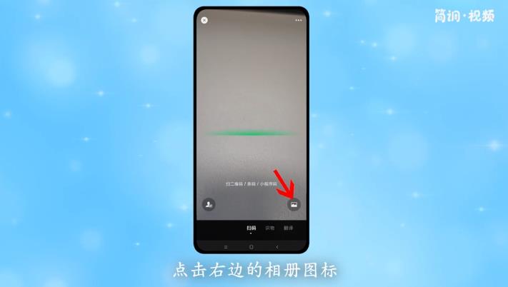 3.以扫描保存的群二维码图片为例,点击右边的相册图标。进入相册后,找到群二维码图片,点击图片;