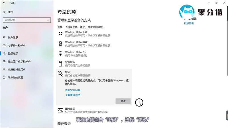 3.点击左边的“登录选项”,然后点击右边的“密码”,选择“更改”。