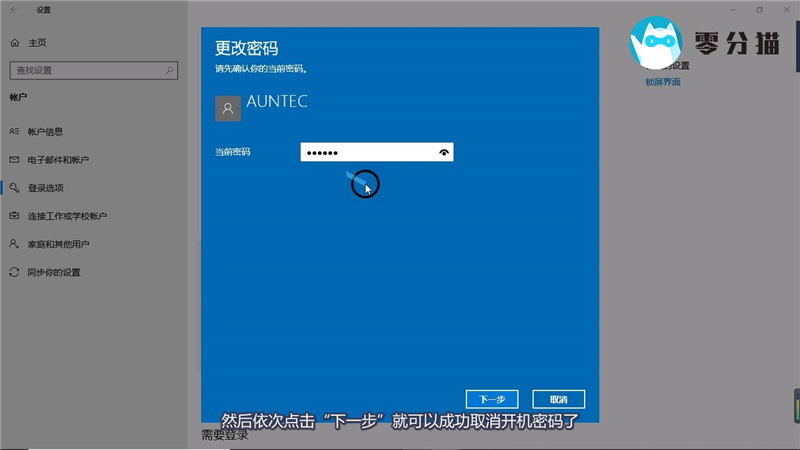 4.在窗口中输入当前密码,然后依次点击“下一步”成功取消开机密码。