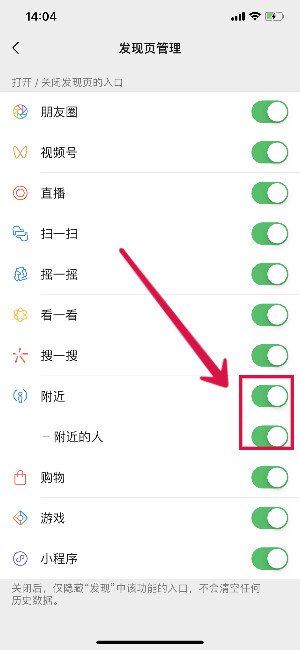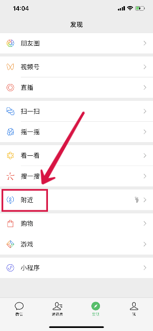 最后回到发现页面,点击“附近”进入附近的人页面。