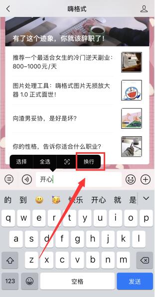 然后按住输入框,在弹出的菜单中点击“换行”选项。