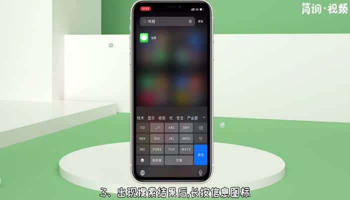 3.搜索结果出现后,按住信息图标,拖动到手机桌面,设置需要放置的位置;