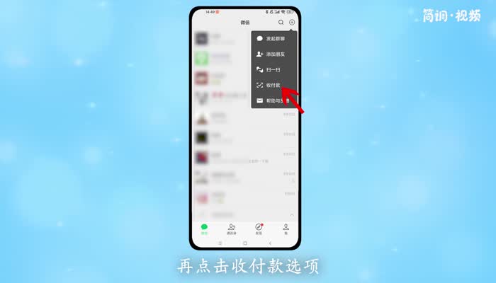 1.打开微信,点击右上角的数字,然后点击“收付款”选项;