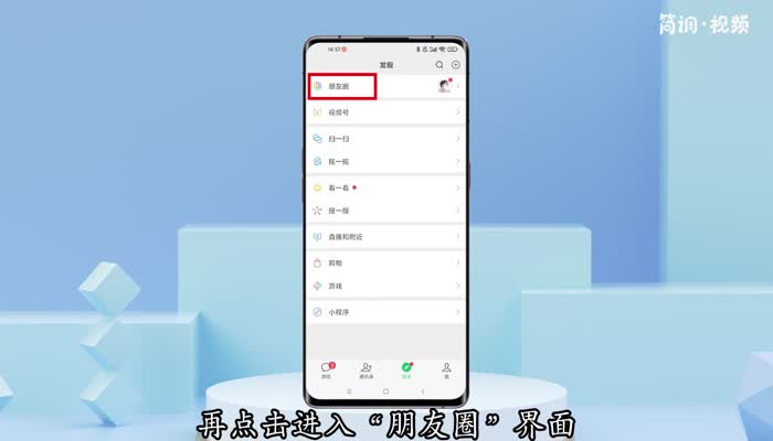 1.打开微信,点击页面的“发现”选项,然后点击进入“朋友圈”界面;