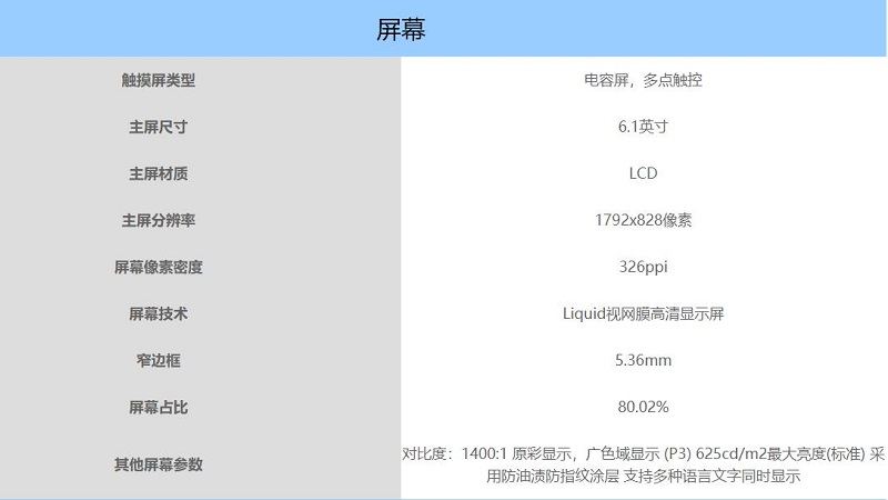 iPhone xr采用了全新设计的6.1英寸液晶视网膜显示屏(全屏),分辨率为1792*828,每英寸像素为326ppi。它支持P3宽色域和轻触唤醒。