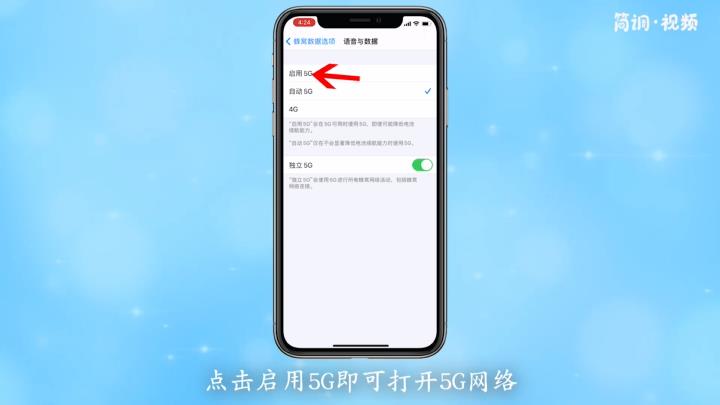 4.进入语音和数据页面后,点击启用5G,打开5G网络。