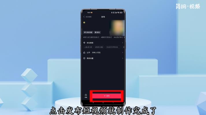 5.在视频发布界面,输入标题、位置等。并点击“发布”,短视频完成。