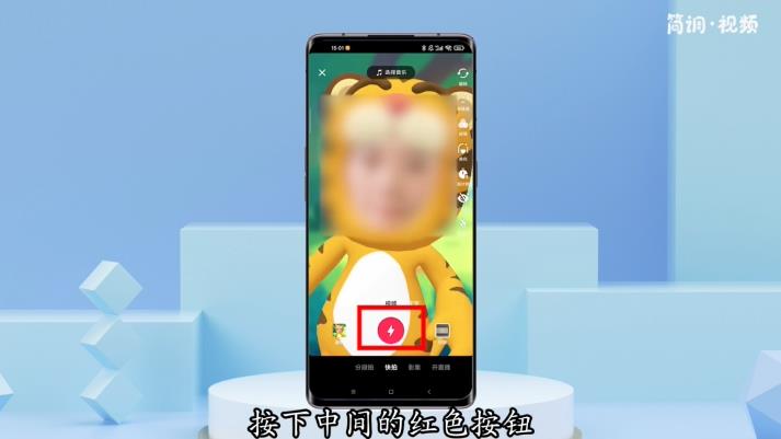 2.在视频拍摄界面,使用道具、滤镜、美化功能。设置好之后,按中间的红色按钮,先拍一段视频;