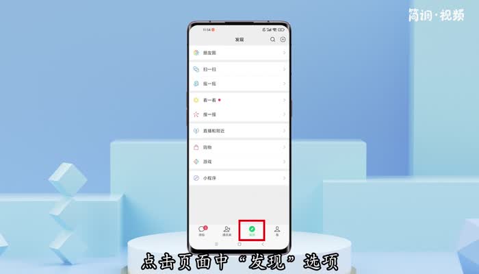 1.打开微信,点击页面的“发现”选项,然后点击“朋友圈”进入朋友圈界面;