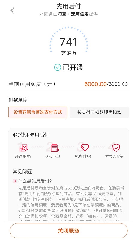 淘宝先用后付,是指淘宝针对芝麻分550分以上的消费者。购买带有“先用后付”服务标志的商品,有机会享受“0元下单,到期付款”的专属服务。消费者加入先用后付服务后,可以获得一定的信用额度,消费者可以在该额度内以0元先下单购买商品。