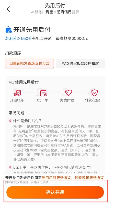 4.选择[确认打开]按钮,先使用后支付。