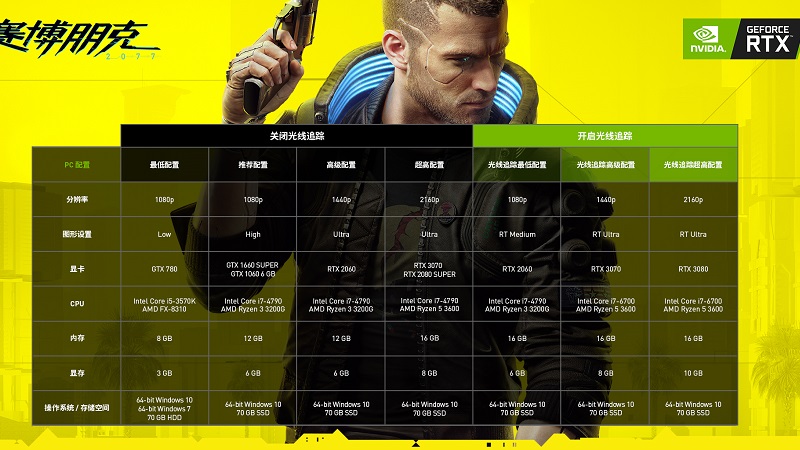 《赛博朋克2077》官方电脑配置要求如下图所示。需要注意的是,其实只有两个地方,一个是CPU,一个是显卡。其他配件不会有太大影响。