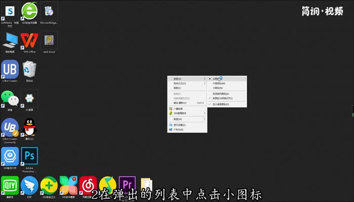 2.点击弹出列表中的“小图标”,在桌面上显示小图标;