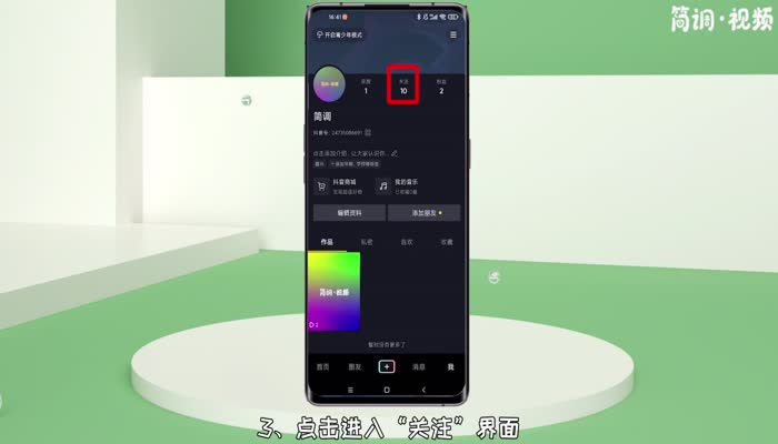 3.点击进入“关注”界面。如果是跟着对方,对方照顾自己的时候,头像后面的“跟着对方”就变成了“跟着”。你可以通过看文字来判断对方是否照顾自己。