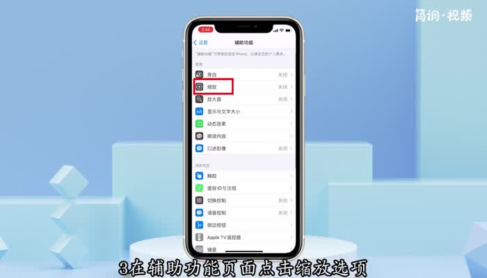 3.在辅助功能页面点击“缩放”选项,进入缩放设置页面;
