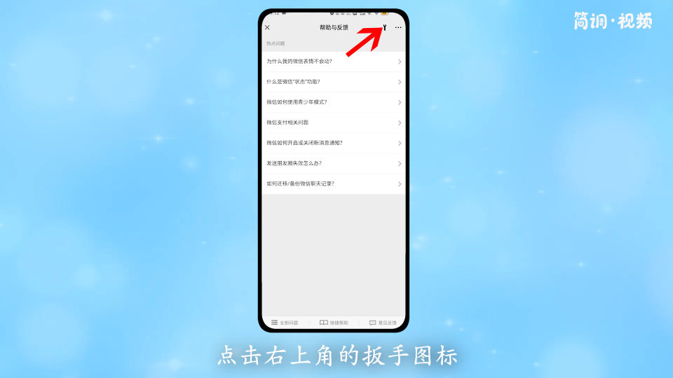 4.进入帮助和反馈页面后,点击右上角的“扳手”图标,进入微信维修工具页面;