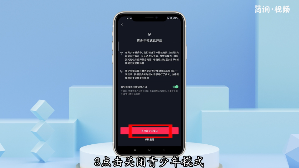 3.点击“关闭青春模式”,输入密码退出青春模式;