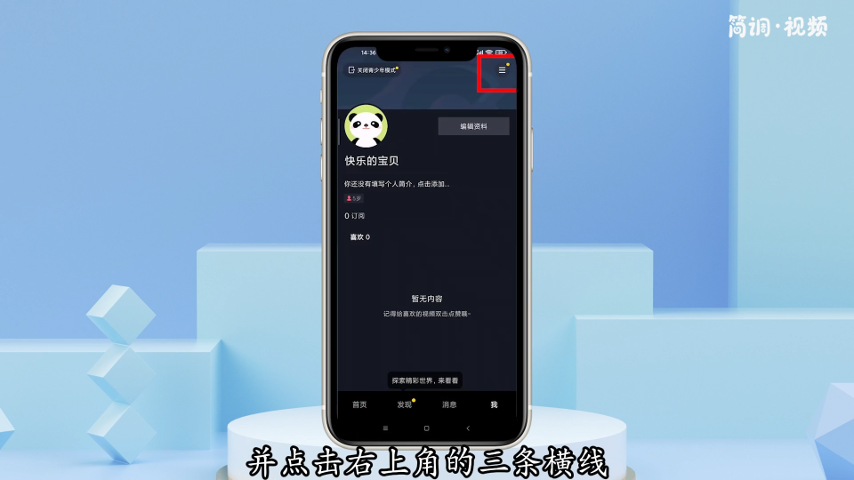 1.打开Tik Tok,切换到“我”界面,点击右上角的三条水平线;