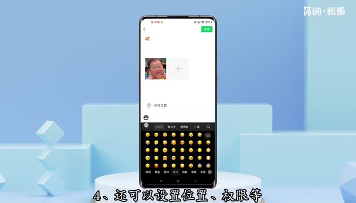 4.还可以设置位置、权限等。设置完成后,点击右上角的“发布”即可发布这条朋友圈。