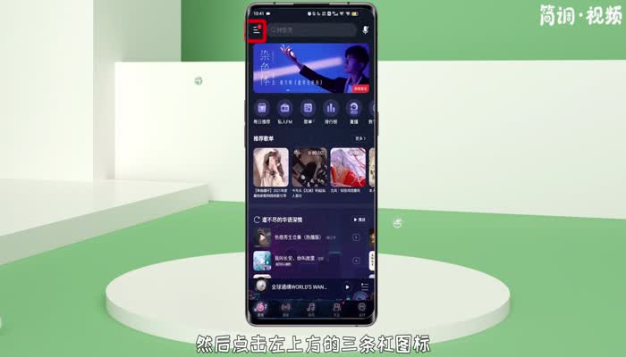 1.在手机桌面打开“网易云音乐”,然后点击左上方的三个条形图标;