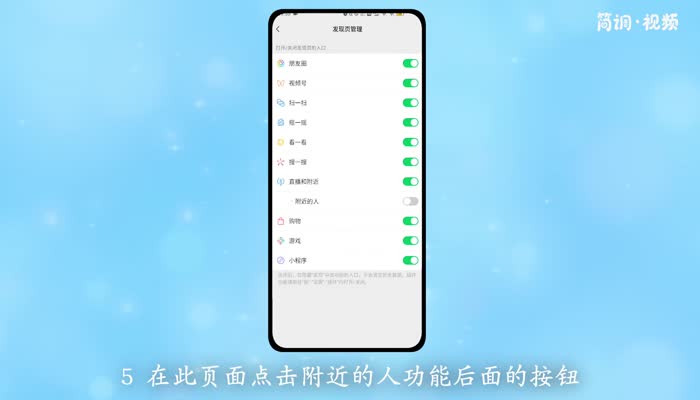 微信上没有附近的人功能,也就是说关闭了这个功能。您可以在“发现页面管理”中打开它。具体操作步骤如下: