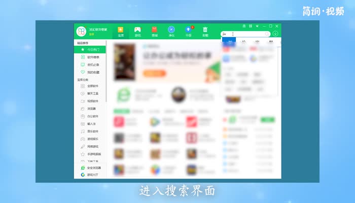 1.打开360软件管理器,点击右上角搜索框进入搜索界面;