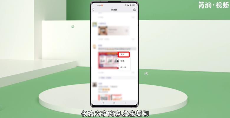 2.在朋友圈界面,找到想要转发的朋友圈,长按文字内容,点击复制;