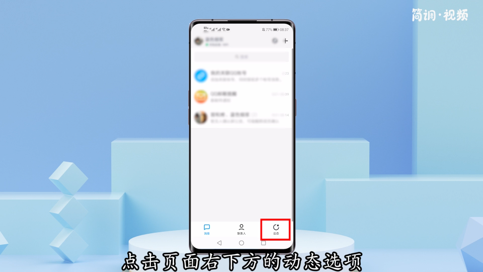 1.打开QQ,点击页面右下方的“动态”选项,进入动态页面;